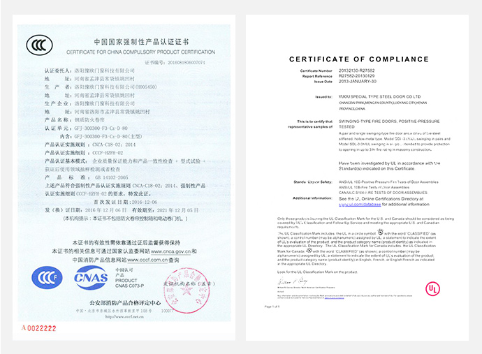 鋼質(zhì)防火門是指用冷軋薄鋼板作門框、骨架、門板,在門扇內(nèi)填充不燃隔熱材料,根據(jù)需要可以在門扇上安裝復(fù)合防火玻璃及門扇上方設(shè)有A類復(fù)合防火玻璃亮窗,并配以防火五金配件所組成的能滿足耐火完整性和隔熱性要求的門。鋼質(zhì)防火門按耐火極限可分為甲 級、乙級、丙級三類防火門,其耐火極限要求分別為72min、54min和36min。鋼質(zhì)防火門應(yīng)采用冷軋薄鋼板制作門框、門扇面板及加固件。門框與門扇鋼板厚度分別為1.2mm~1.5mm和0.8mm~1.2mm。加固件鋼板厚度為1.2mm~1.5mm,如設(shè)有螺孔則不低于3mm。用于鋼質(zhì)防火門的五金配件需要是耐火五金配件,主要五金配件為:防火合頁(鉸鏈)、防火插銷、防火門鎖、防火順序器和防火閉門器等。
